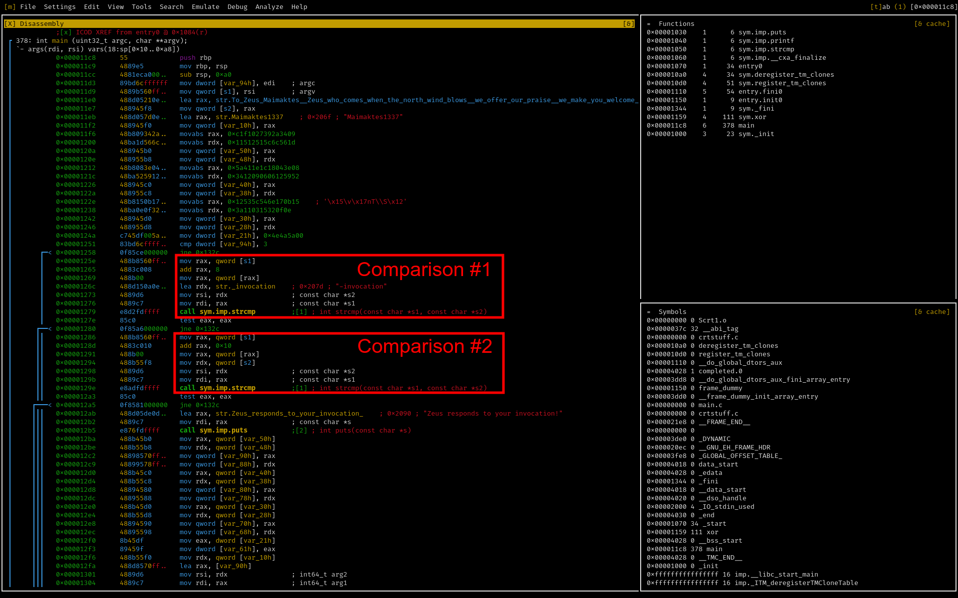 If we trace the value of the parameters to the second strcmp call, we can see that rsi takes on a value computed earlier in main by the first lea instruction. This instruction computes the address of a string in the program's .rodata section, namely: "To Zeus Maimaktes, Zeus who comes when the north wind blows, we offer our praise, we make you welcome!". This leaves us with the final invocation: